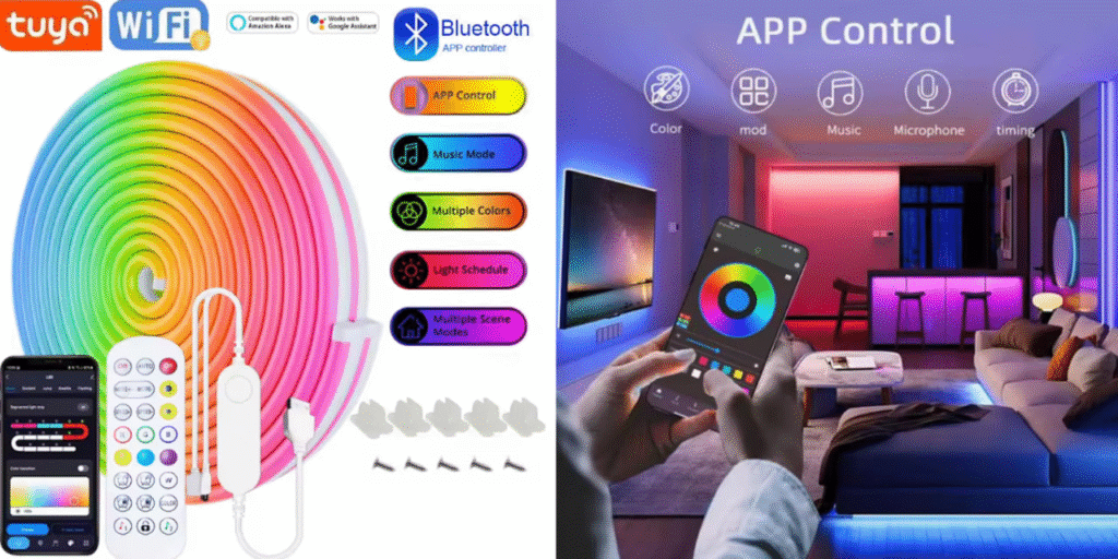 Гнучка RGB-світлодіодна стрічка довжиною 1-5 метрів живиться від USB і керується через Wi-Fi. Сумісна з програмами Tuya, Smart Life та голосовими помічниками Alexa/Google. Працює від 5В, ідеально підходить для підсвічування робочого столу, ТБ, ігрового простору та інтер’єру. Підтримує різні режими кольору та динамічного підсвічування, створюючи ефектний неоновий декор.