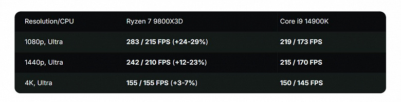 При переході на роздільність 1440p різниця між чіпами зменшилася до 12%, проте в окремих моментах Ryzen все ще виривався вперед на 23%. У 4K роздільності відеокарта стає головним обмеженням, і відмінність у продуктивності процесорів знижується до 3–7%. Енергоспоживання Ryzen залишається в межах 100–110 Вт, а у Core i9-14900K — з 170–180 Вт знижується до 150–160 Вт.