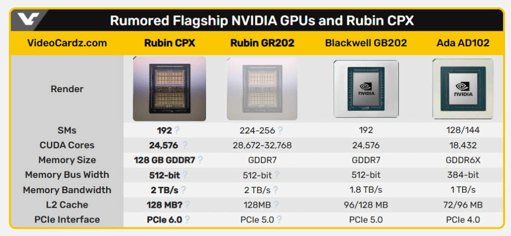 Згідно з рендерами, Rubin CPX здатний об’єднувати 16 графічних кластерів по 6 TPC кожен — це 192 потокових мультипроцесора, як у GB202. Проте якщо конфігурацію доведуть до рівня Blackwell із 8 TPC, кількість SM зросте до 256. Можлива підтримка PCIe 6.0, пам’яті GDDR7 з 512-бітним інтерфейсом та до 256 ROP. Для порівняння, RTX 5090 на базі GB202 має 192 SM і 176 ROP, тож Rubin CPX обіцяє помітний приріст.