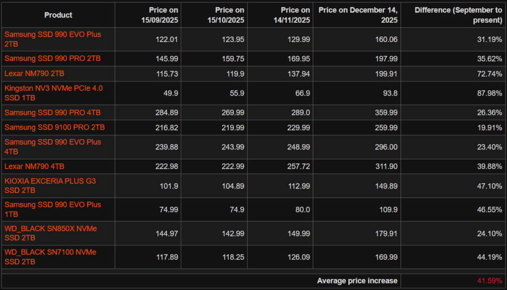 Зростання цін торкнулося не лише оперативної пам’яті. Твердотільні накопичувачі в Європі сьогодні коштують у середньому на 42% дорожче, ніж у вересні. Навіть базові SSD обсягом 1 ТБ майже досягли ціни близько $110. Подорожчання не оминули й жорсткі диски — за останні місяці їхня середня вартість зросла приблизно на третину.