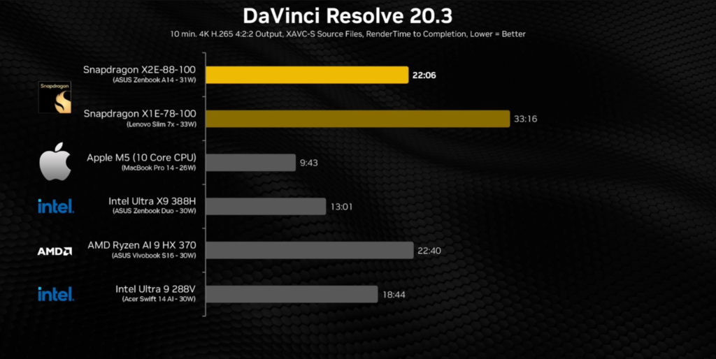 Втім, загальна картина виявилася не такою однозначною. У DaVinci Resolve Snapdragon X2 Elite виступив украй слабко та посів останнє місце, поступившись усім конкурентам. Лідером у цьому тесті, навпаки, став Apple M5.